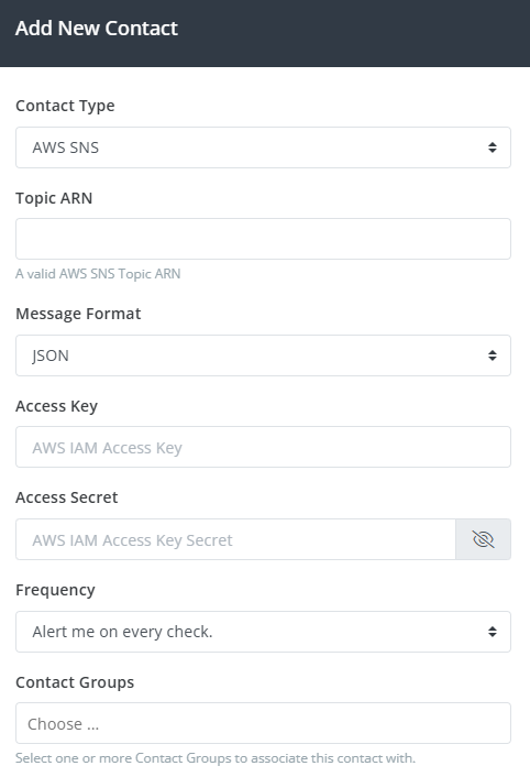 Select AWS SNS from the Contact Type drop-down, enter the ARN of the SNS Topic, the Access Key & Secret of your IAM Access Key, select a Message Format, a Frequency, and select one or more Contact Groups to associate with this new contact.