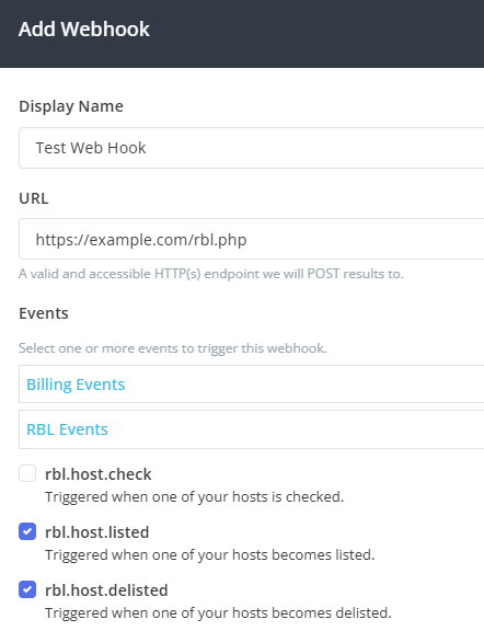 rbl.host.check.started– Triggered when a check is started for one of your hosts.rbl.host.check.completed– Triggered when a check completes for one of your hosts.rbl.host.listed– Triggered when one of your hosts becomes listed.rbl.host.delisted– Triggered when one of your hosts becomes delisted.
